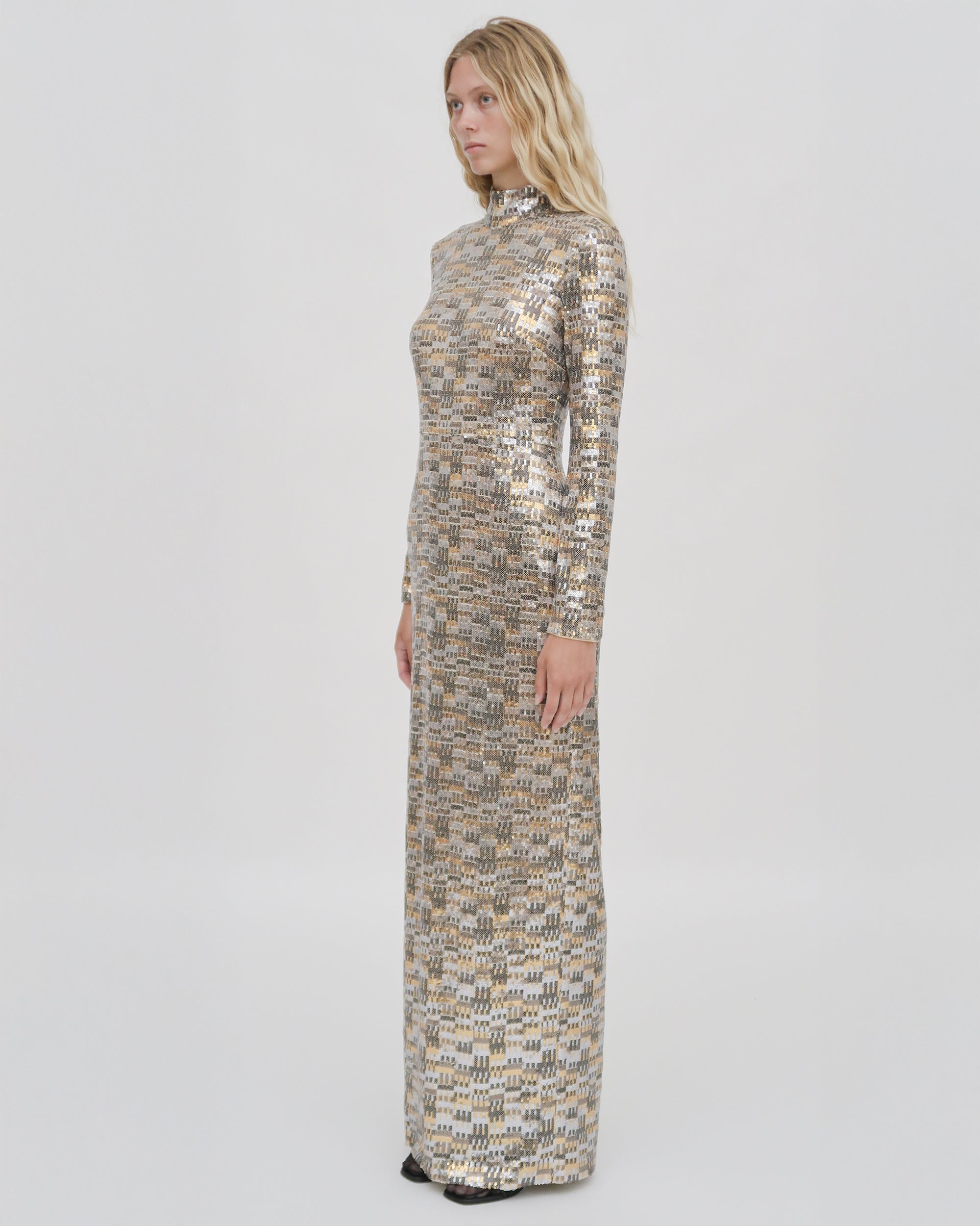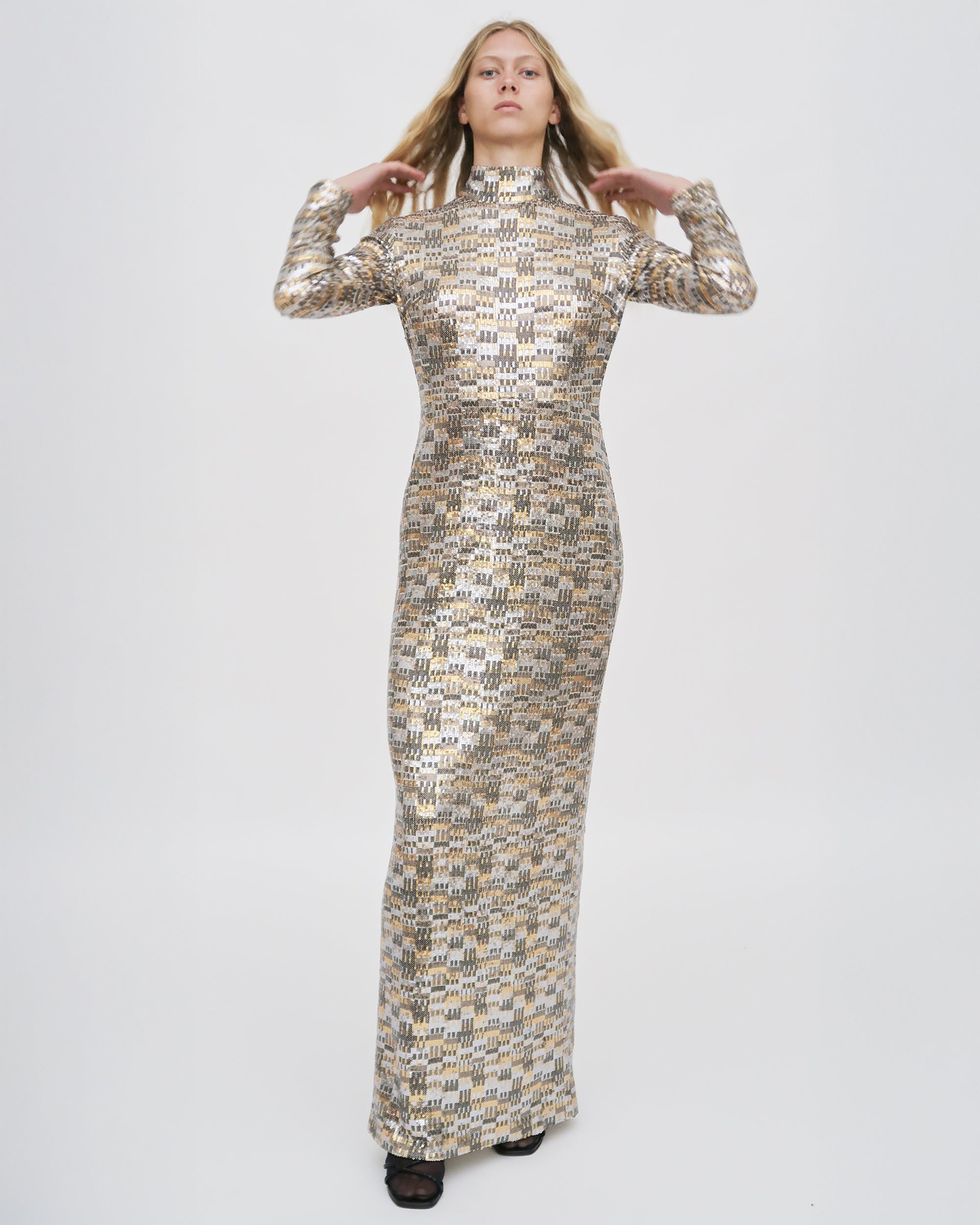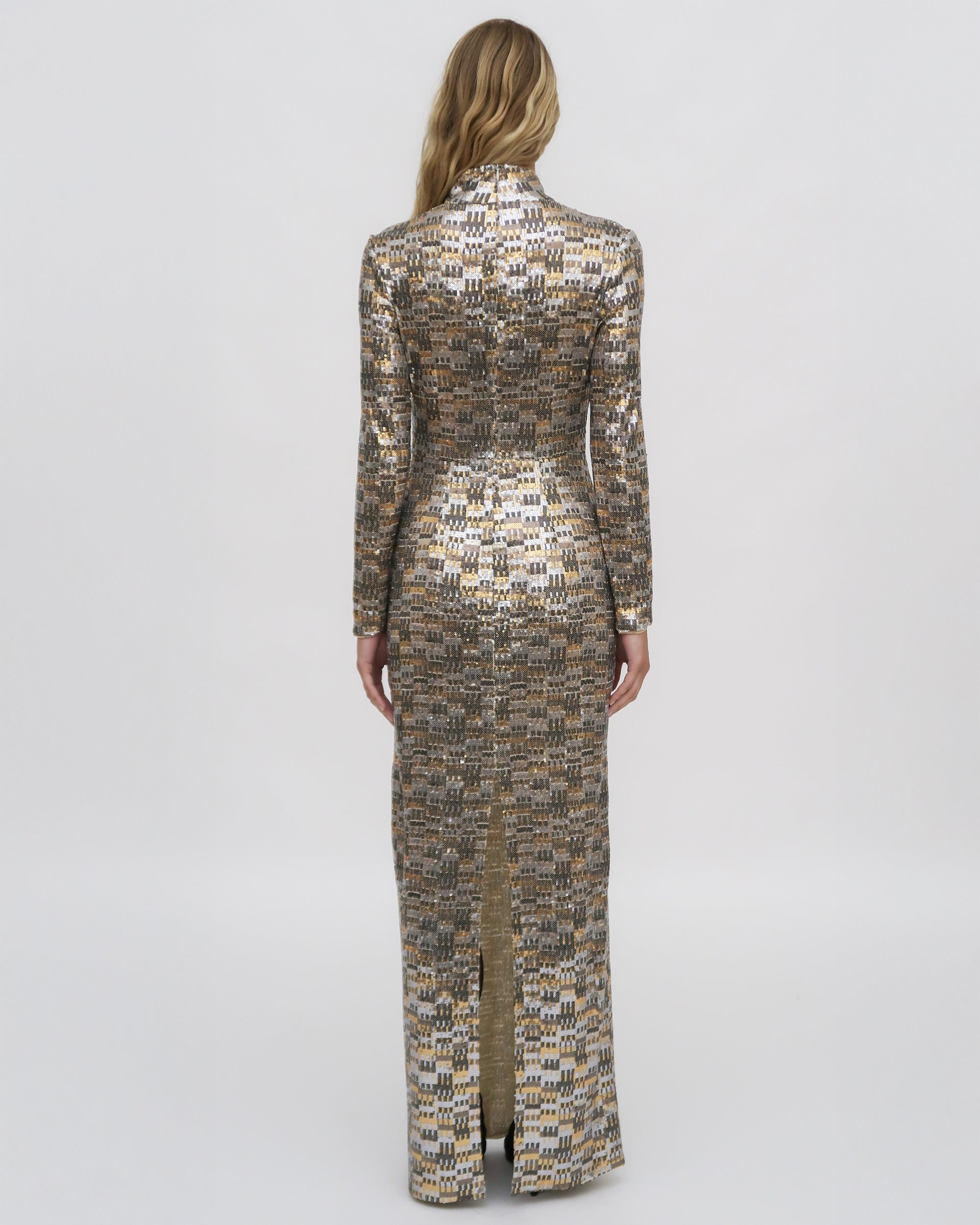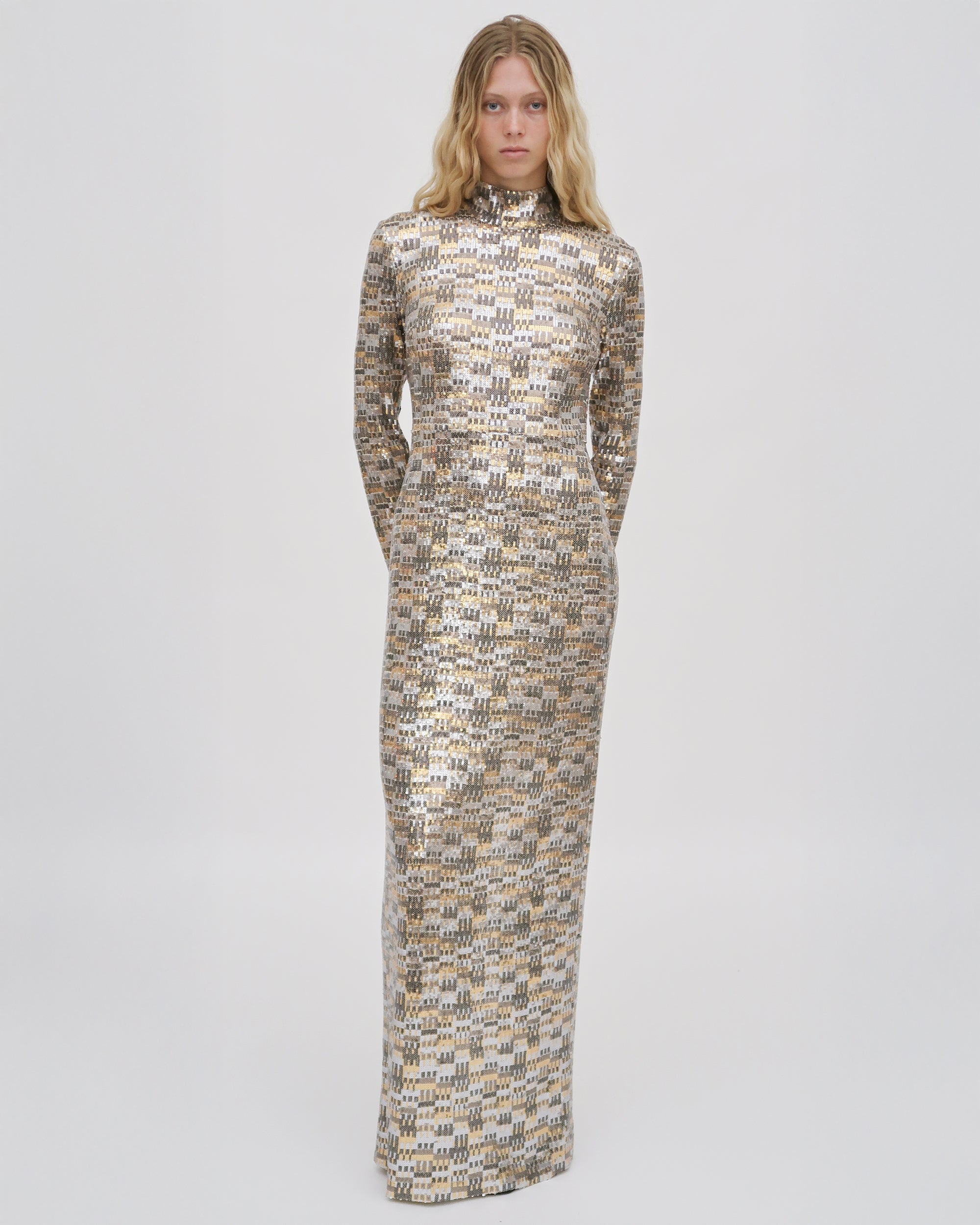 A bold study in form and texture. This fitted maxi dress is crafted from sheer mesh and fully embroidered with sequins in a vivid Bauhaus-inspired pattern. The long, lean silhouette hugs the body with a sculptural elegance, while the high neckline and full-length sleeves balance the expressive palette with refined structure. A true statement piece—sleek, artistic, and impactful.