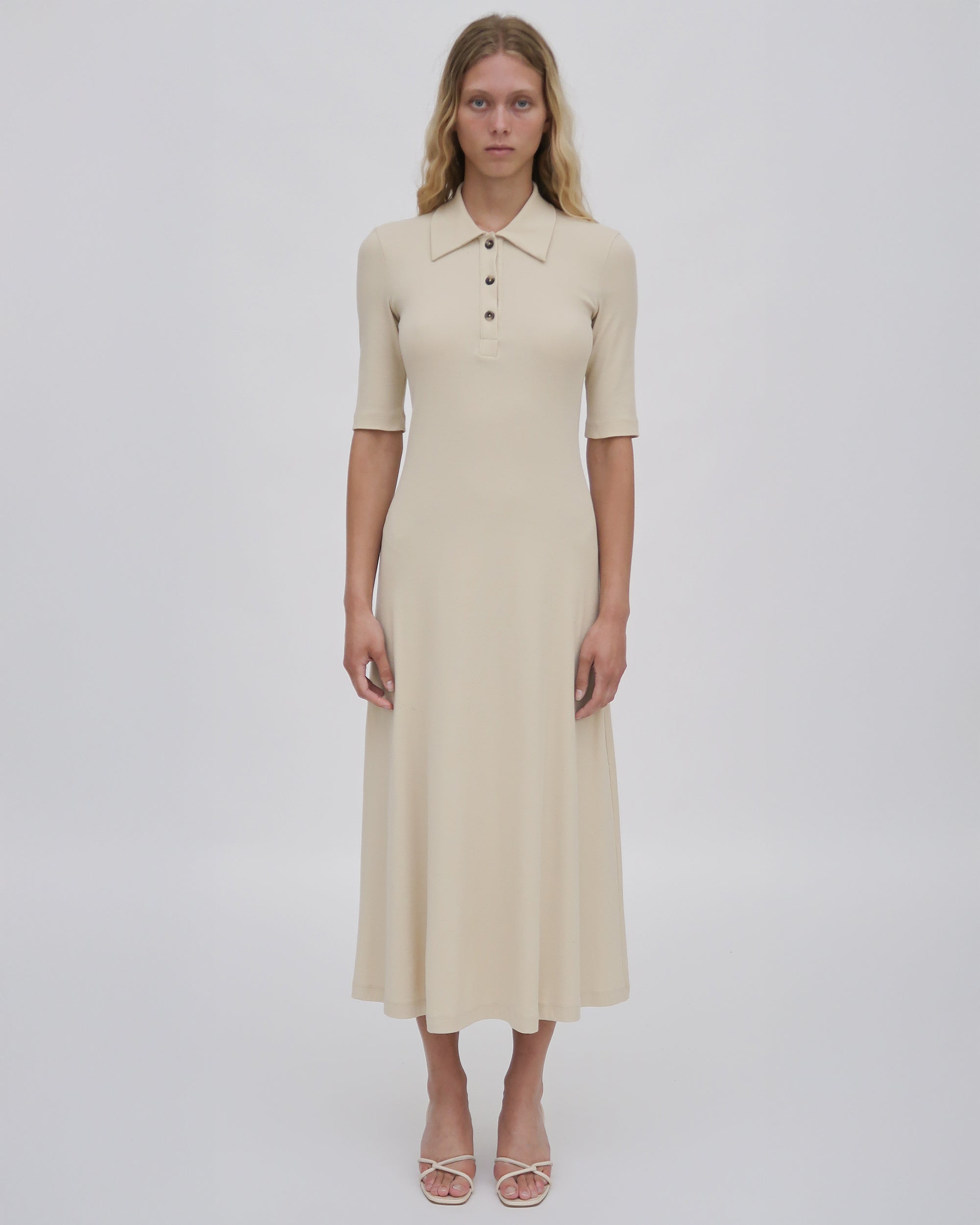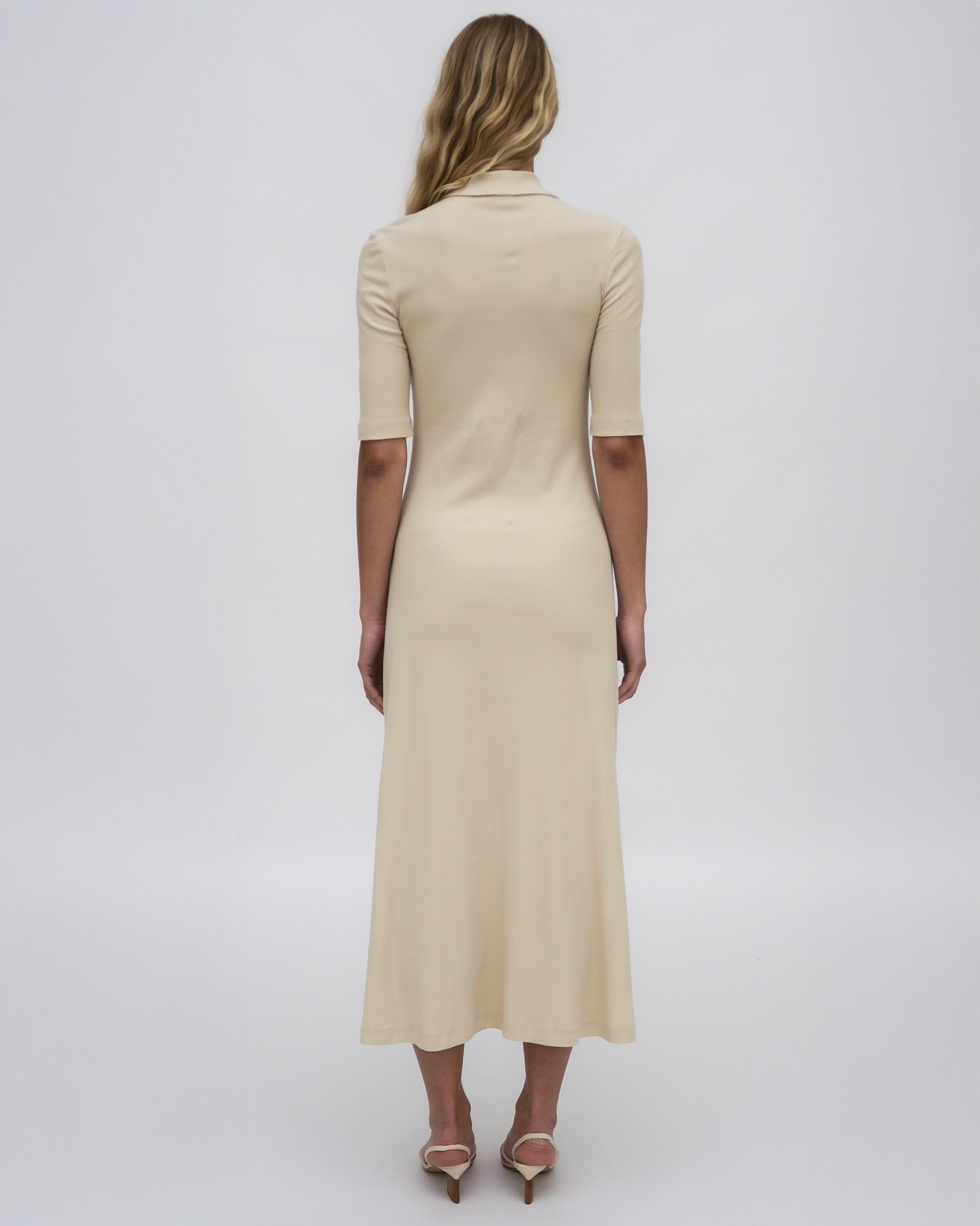 Cut close to the body before falling into a fluid A-line shape, this comfortable dress silhouette is effortless yet refined. The soft feel of the signature fiber Mercerized Cotton Jersey makes the piece infinitely wearable and easy to style while still flattering the natural body.